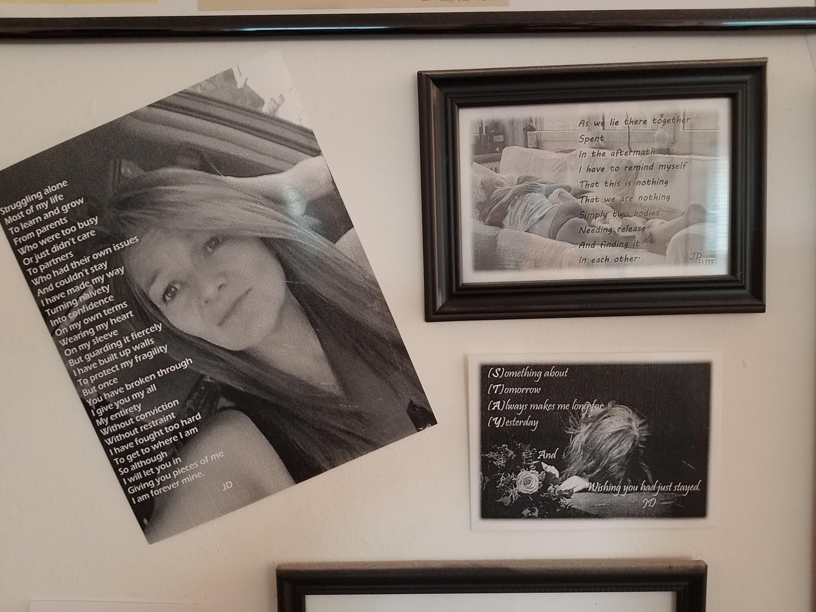 JG: Wow. Now you\’re asking the hard questions. Currently sitting beside me on my nightstand, plus 2 on my bed, are 10 journals filled with words. Pieces about myself ring true and I love that I was able to put them out there for the world (or, at least my little corner of Lettrs and Instagram) to see. I also love my Father series, which is up to LVII (number 57) and my Tango Series, which is about me and him, him and me. All we do is \”tango,\” but we\’ll never be dancing partners. Nevertheless, two of my all time favorites hang on the wall behind me as I type this. They are from the same point in time and about the same situation. And I will point out, for better understanding, that I believe that holding hands is a very intimate thing and that hands don\’t lie.