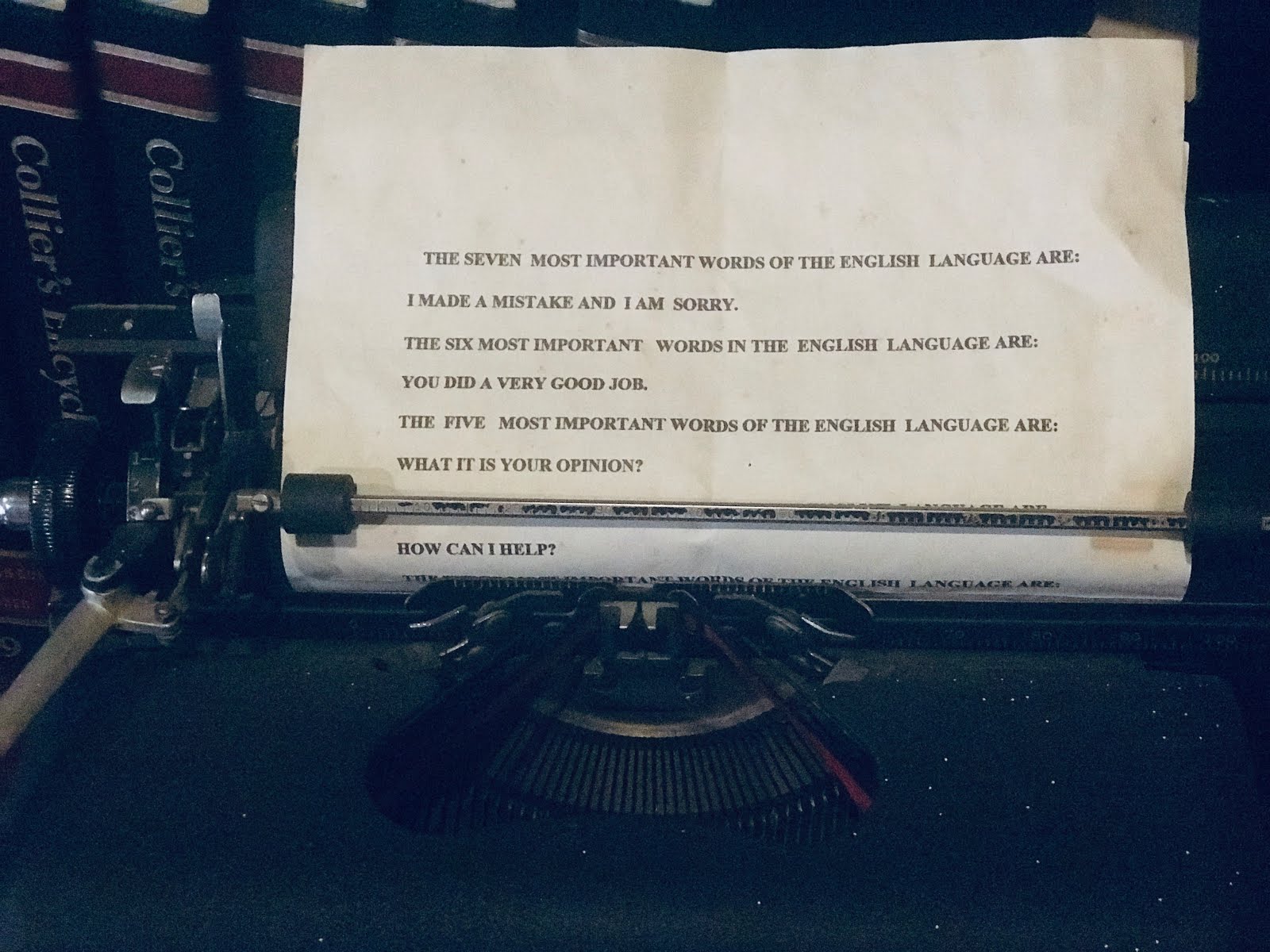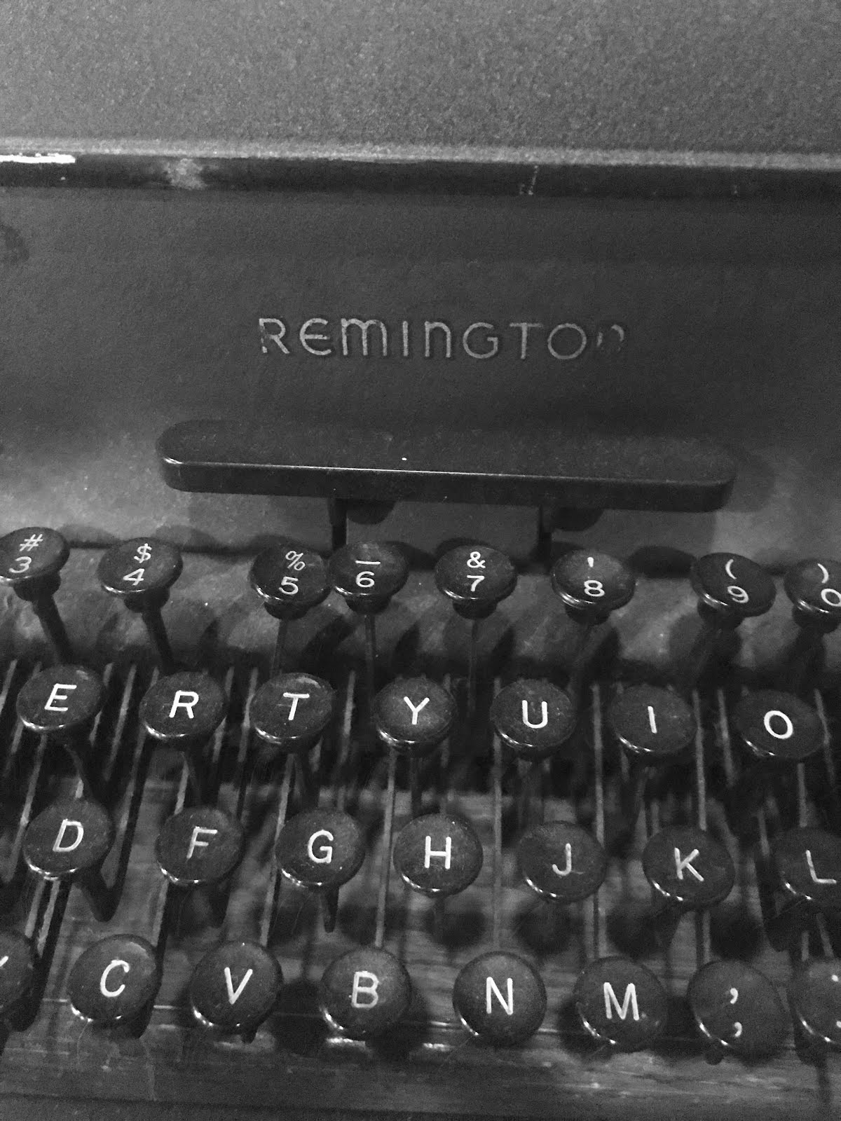 The photograph above is my father’s typewriter. He was gifted it by an attorney who befriended him when he came to the United States- My father was learning English and working at various menial jobs where language wasn’t an issue- to put food on the table for his wife and two young kids at the time. The attorney came to realize what an intelligent man my father was and learned of his background in journalism and love of words and writing. He was surprised because my father didn’t talk about himself, his positions or achievements and never once did he complained about his lot in life. (As a little girl, my father is the one that taught me to respect everyone; “Treat the janitor the same as you would the President”). Moved by my father’s humility- the attorney told him that after he had mastered the English language he would need a typewriter for future endeavors and he gave him the Remington- which my father treasured. I have since inherited this beautiful machine, filled with deep appreciation of its rich and meaningful history. The paper in this typewriter is from my father’s English class.”-