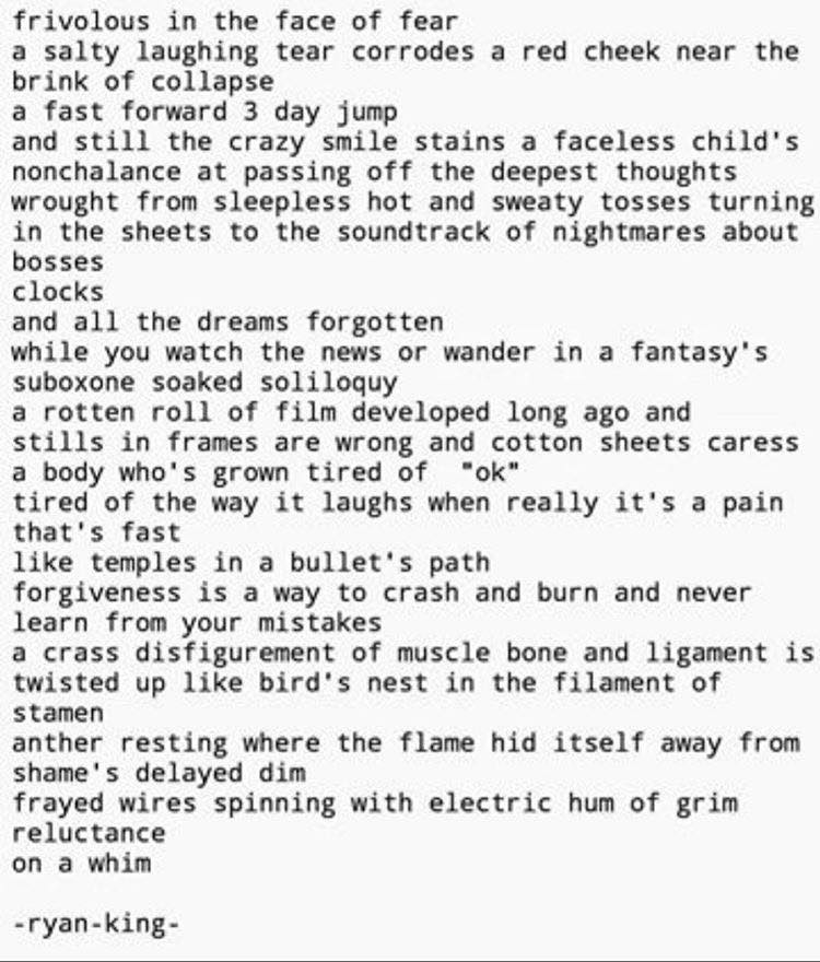 RK: Well, I don\’t know if I think of it as a block. There are times when I try to write and it all just seems wrong. I could still write, but it would all be shit so I just don\’t even try. There was a time when this used to frustrate me as a songwriter, but, for some reason, with poetry I just wait for it to speak to me again. To overcome it, I just wait, or write out the bullshit until I get onto something, I know I can do something with. Sometimes you just need to give it a break and wait. Come back later. Listen to music. Watch a movies. Explore a different art form. Drink alcohol. Do drugs. Come back later.