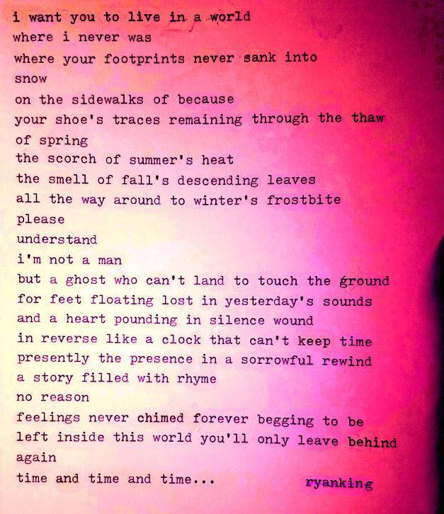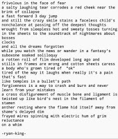 RK: I don\’t necessarily have a favorite theme. I write about many different emotions and situations. I suppose that I explore my own psyche a lot and then translate what I find into something interesting or striking to read. My style varies a lot between poems and seems to always be changing. Electricity, concrete, oceans, rivers, movement, decay, and the personification of many different things seem to be common themes for me.