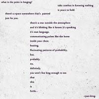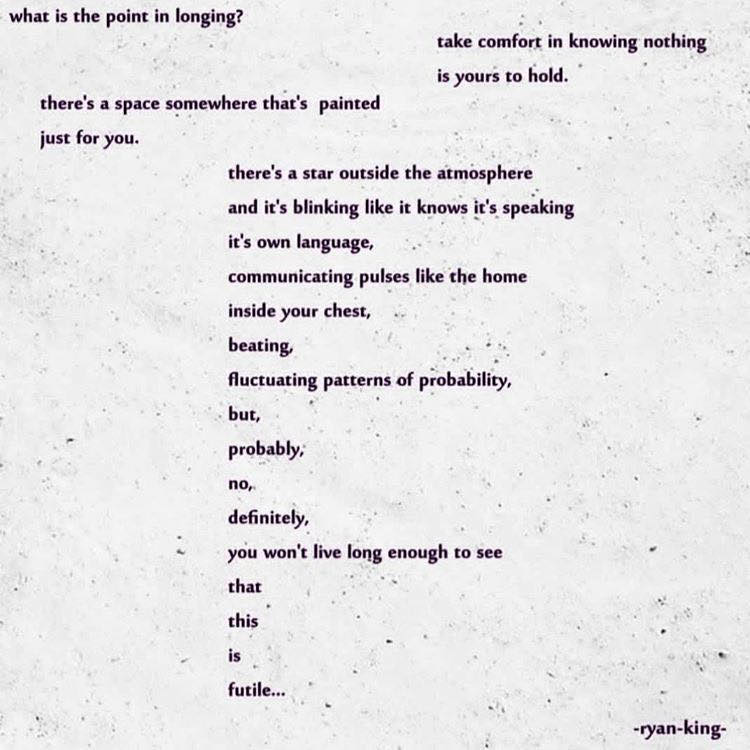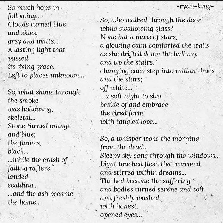 RK: The hardest poem I\’ve written would have to be a series that I\’m still working on, called, This is a Building. The difficulty in writing this comes from the fact that it started during a very chaotic time in my life when my mental health was declining rapidly, and some very big changes were happening, and I kind of knew where these changes were going to lead. I was manic for a long time, suicidal, very irritable and drinking way too fucking much and too often. So, the words came very naturally, but the first 3 poems in that series really took a toll on me emotionally.