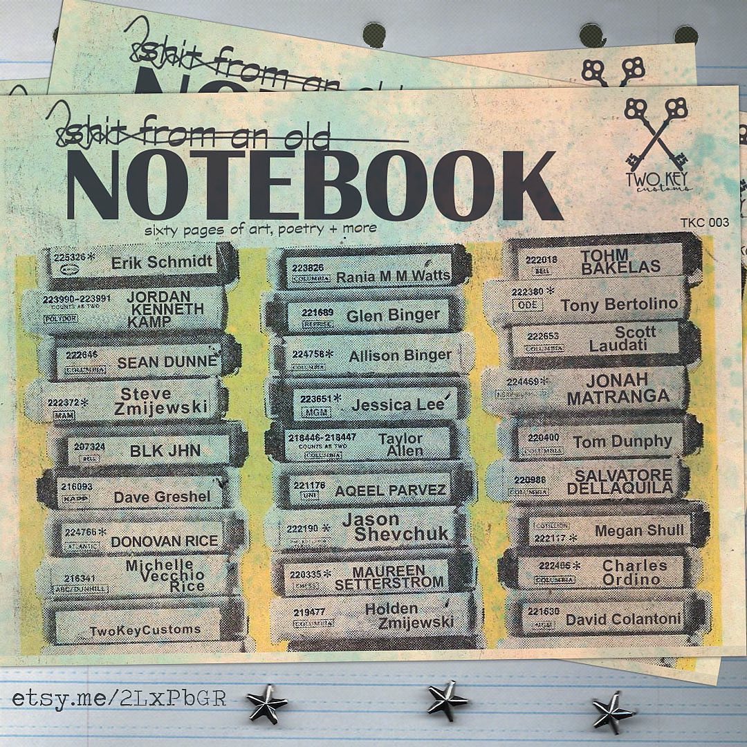I am very persnickety when it comes to placing my work in books however, when Steve Zmijewski from Two Key Customs requested one my of pieces for his Anthology Stuff From an Old Notebook — feat. 26 poets, artists & musicians and 1 three year old I was compelled to provide a big resounding \’YES\’. I am extremely proud to be a part of this collection along with some of my friends who are equally strong scribes and artists, see for yourself in the Cast of Characters below.