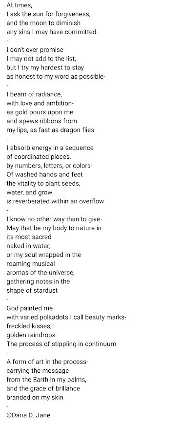 I relish interviewing strong souls who go about their life in benefit of others; Dana is one of the soulful people in my rolodex. Dana and I discuss, poetry, change in career, the importance of being true to one’s self, and Dana’s strategic plan to enroll in academia with a little bit of gentle loving bulldozing added pressure from moi.